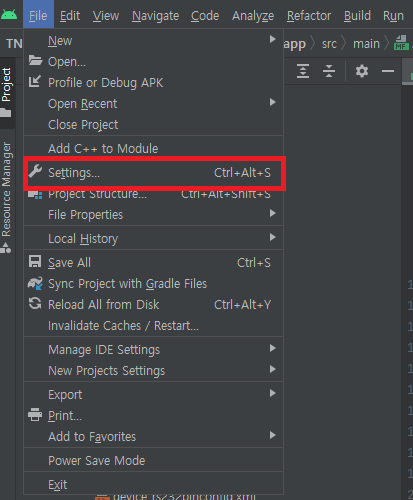 먼저 왼쪽 상단에 File Tab에서 Settings... 항목을 클릭합니다.