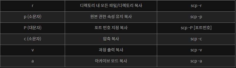 명령어 : scp [option] [filename] [원격지 사용자]@ [원격지 IP]:[폴더 트리 위치]