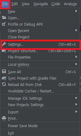 안드로이드 스튜디오 상단에 File > Settings... 탭을 클릭합니다.