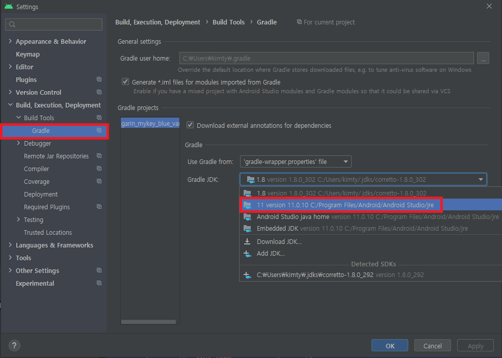 그다음 Gradle 메뉴에서 Gradle JDK부분에 콤보박스를 눌러