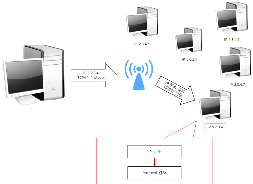 위그림과 같이 IP는 데이터가 찾아갈 주소,
