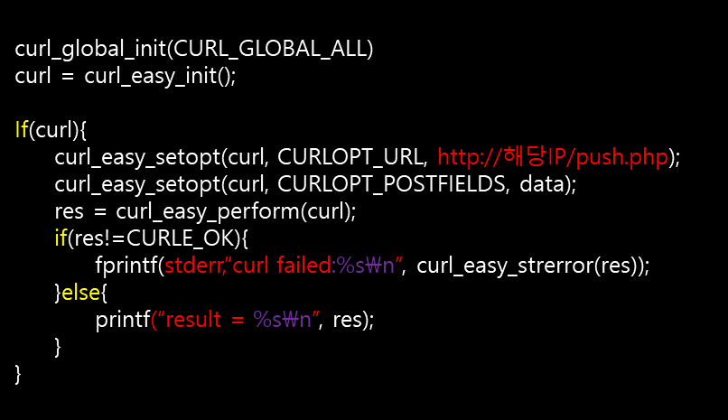 C언어에서는 curl 라이브러리를 통해 php에 push 메시지에 대한 내용을 전달합니다.