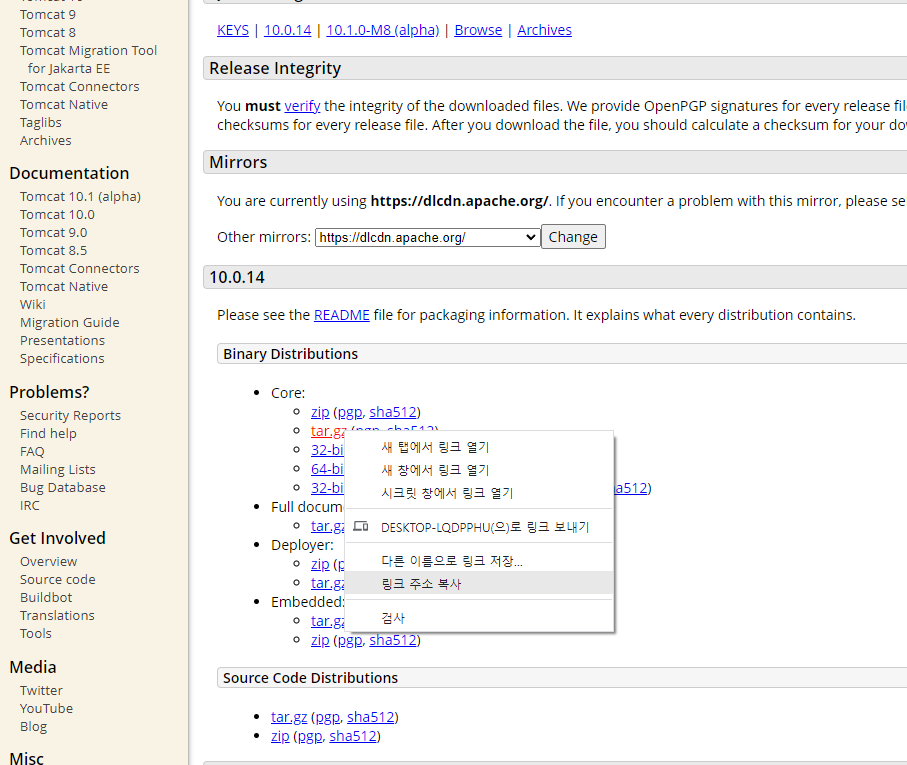 tar.gz에 오른쪽 마우스 링크 주소 복사를 해줍니다.
